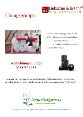 Sie waren bereits bei mir in Behandlung und möchten die gelernten Übungen vertiefen oder erweitern oder Sie möchten die Liebscher und Bracht -Engpassdehnungsübungen neu kennenlernen und Schmerzen bekämpfen oder vorbeugen? Kein Problem, in unserer Übungsgruppe sind Sie gut aufgehoben. Jeden Montag trainieren wir einen anderen Körperbereich, alle Teilnehmer sind keine Spitzensportler und haben das eine oder andere Wehwehchen. Dank der kleinen Teilnehmerzahl von max. 8 Leuten, gehe ich individuell auf jeden ein und passe die Übungen den Bedürfnissen an. Es gibt keinen Druck, keine Zwang und auch ne Menge Spaß….