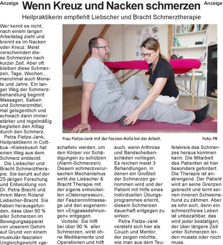 der mal, ob durch eine „falsche“ Bewegung oder Überlastung…. die Ursachen sind oft fasziale und muskuläre Verspannungen. Die Liebscher und Bracht – Schmerztherapie ist ein höchst effektiver Weg aus dem Schmerzzustand, ohne Schmerzmittel und Operationen. Egal ob Sie schon 20 Jahre unter Schmerzen leiden oder akute Probleme haben, egal ob Arthrose oder Bandscheibenvorfall. Es gibt keinen Grund sich damit abzufinden…. Wie diese Therapie funktioniert und ob sie für Sie die richtige Therapie ist, erkläre ich Ihnen ganz individuell in dieser Sprechstunde.